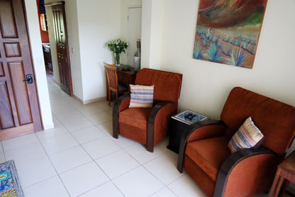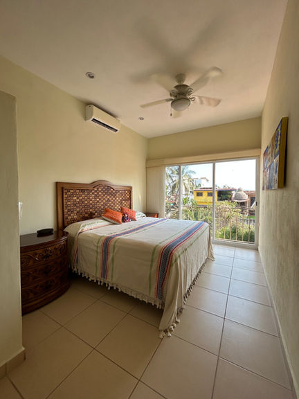 Casita Ola is located on the second and third floor. The bedroom and full bath are located upstairs, while the 1/2 bath, kitchen and family room are found on the lower level. The unit has a large balcony overlooking the pool and gardens. The kitchen is fully stocked with a large sized refrigerator, oven, stove, microwave, cooking and dishware. The counter tops are granite and the doors and cabinets are handcrafted by local artisans. The bathroom counters have beautiful, hand painted tiles.